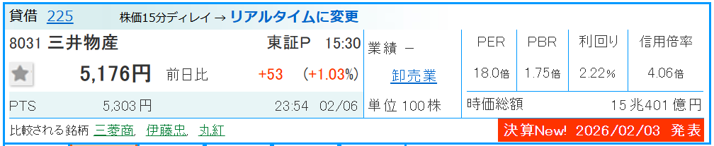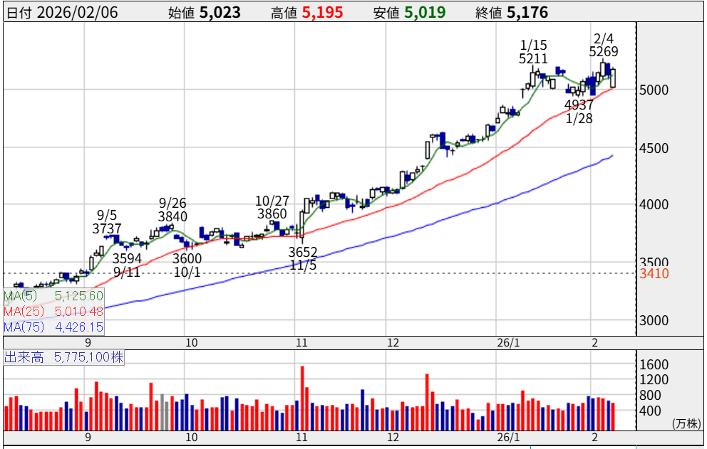 株価5,176円。市場の一部では「資源価格一服」を懸念する声もありましたが、蓋を開けてみれば予想を上回る決算を発表。悪材料を跳ね返して上昇しています。