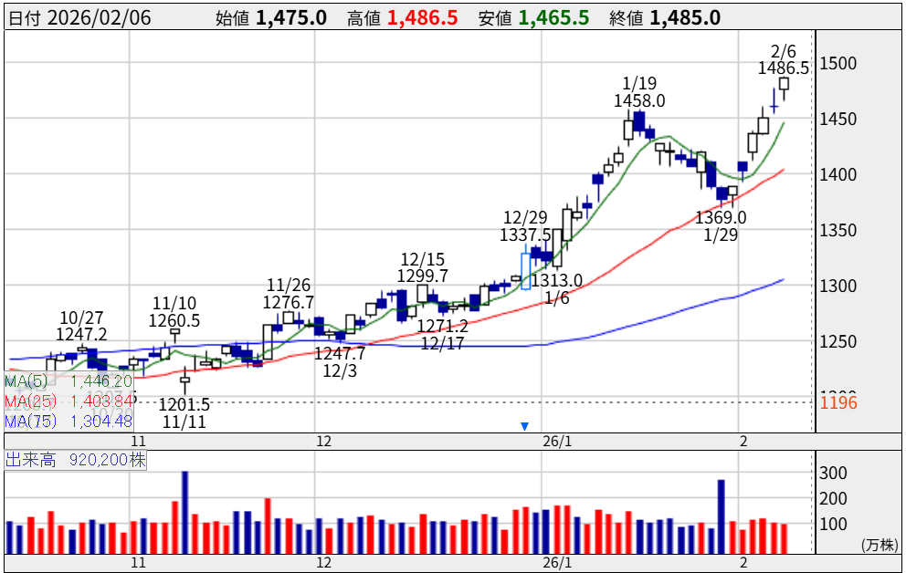 株価1,485円。年初来高値を更新中であり、地味ながらも極めて強固な上昇トレンドを描いています。