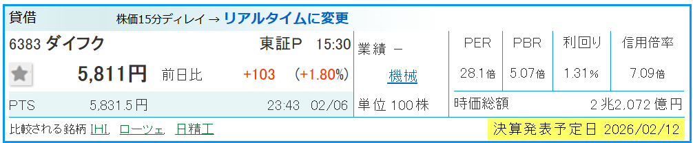 - 圧倒的なシェア: 物流自動化において世界シェア1位の地位は揺るがず、経常利益も堅調に推移しています。PBR5.07倍は一見高いですが、この成長率であれば許容範囲です。