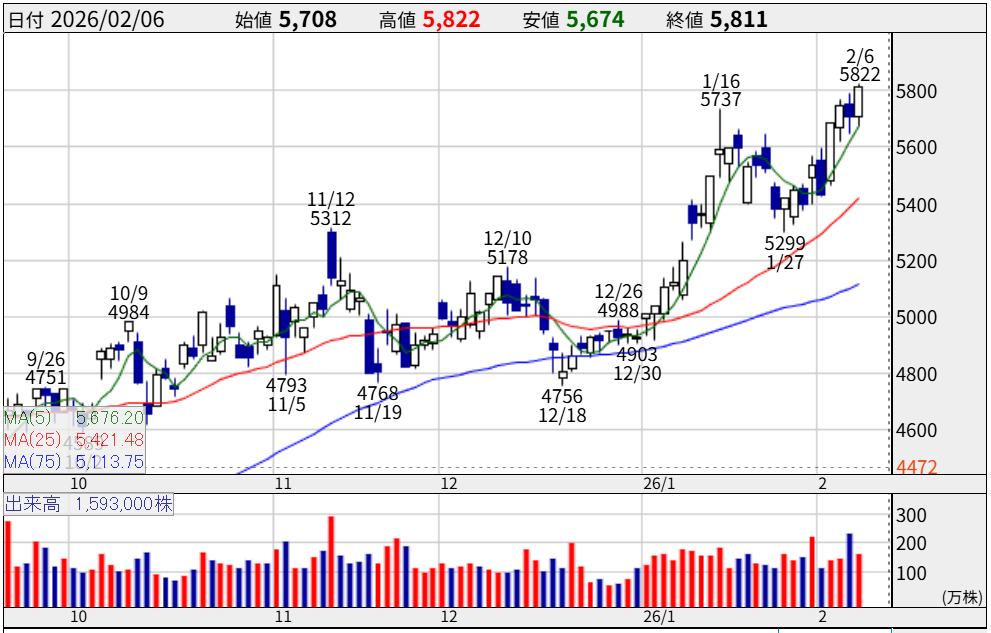 株価5,811円。10年来の高値を更新し、青天井モードに入りつつあります。