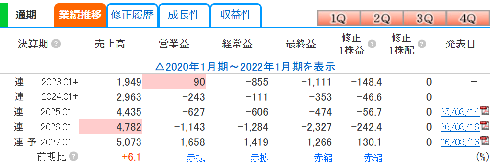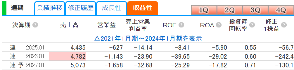 しかし問題は「利益」です。 2026年1月期の営業利益は「-1,143百万円」、経常利益は「-1,284百万円」と、前年から赤字が拡大(赤拡)しています。