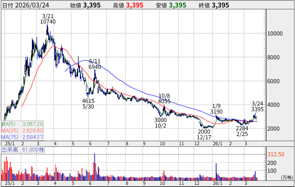 長らく低迷していたテラドローンの株価ですが、2026年3月24日に「3,395円」のストップ高を記録し、出来高も急増しました。
