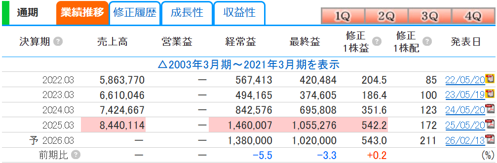 業績推移を見ると、2025年3月期の売上高は8兆4,400億円、最終利益は1兆552億円と、過去最高水準の業績を叩き出しています。