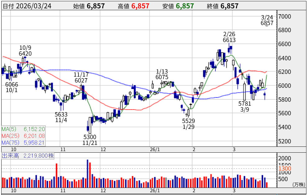 - 2026年3月24日、5,800円台から一気に6,857円まで上昇し、大きな「窓(ギャップ)」を開けました。
