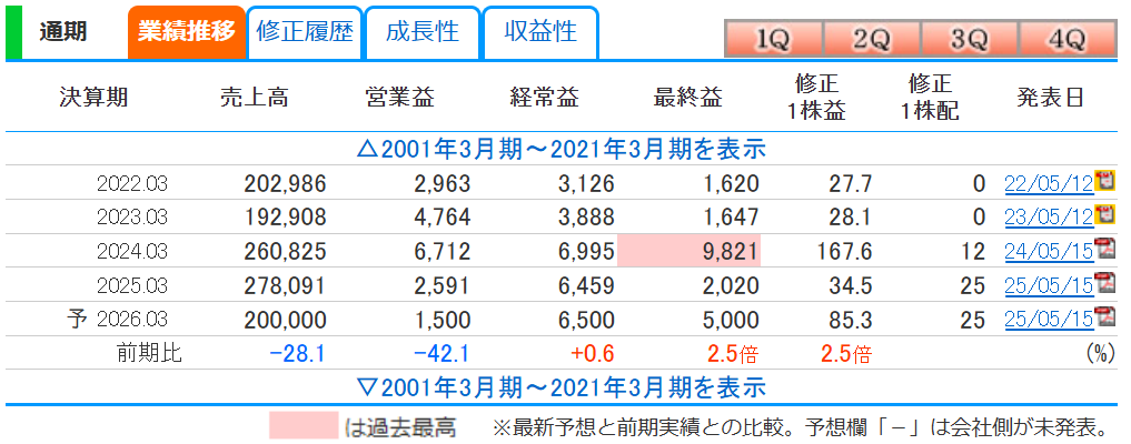 しかし、2026年3月期の会社予想では、売上高が28%減少する一方で最終利益が約2.5倍に増えるという不自然な見通しが示されています。