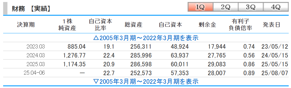 自己資本比率は20%台前半で推移しており、製造業の平均と比較すると低い水準です。