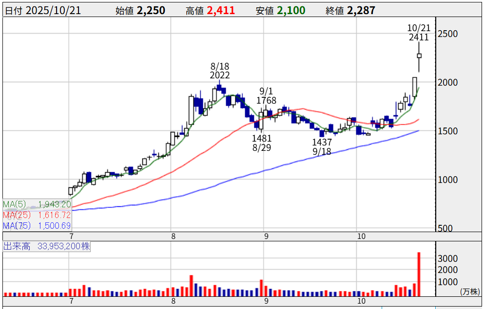 この日、株価は一時前日比15%以上も上昇し、年初来高値となる2,411円を記録 。出来高も急増し、市場の熱狂ぶりを物語っています。