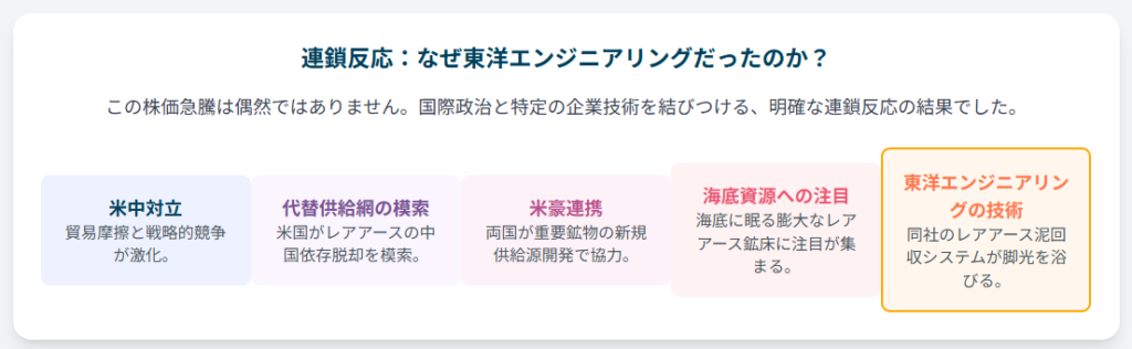 つまり、「米中対立の激化 → レアアースの供給不安 → 代替供給網の模索 → 海底レアアース開発への期待 → 関連技術を持つ東洋エンジニアリングに思惑買いが集中」という連想が働き、今回の株価急騰に繋がったと考えられます。